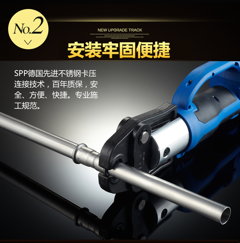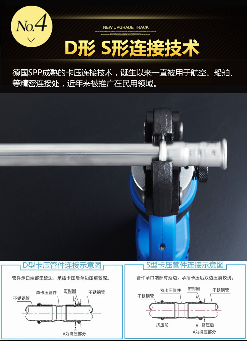 卡壓式連接~分單卡壓跟雙卡壓兩種,由德國率先垂范搭配使用的卡壓式管件,連接強度高,抗震動,滿足嵌入式安裝的要求,極大地減少了隱蔽環境中水管漏水的可能性,滿足了國家CECS153:2003標準,適合DN15-DN100口徑管道使用,避免明火焊接操作。