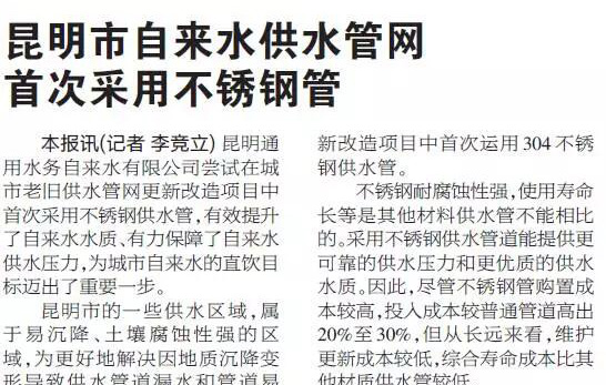 昆明自來水供水管網首次采用304不銹鋼薄壁水管